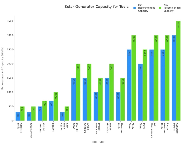 Solar powered generators give crews power for many tools. They can run drills, saws, lights, and big machines. The size of the generator depends on the tool you use. The table below shows what size works best for each tool: